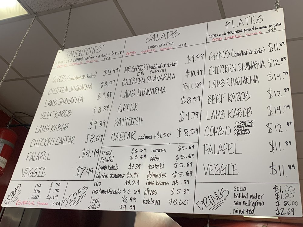 Thin slices of lamb and beef or chicken thinly shaved and tucked into a pita with in house made hummus, tzatiki, and fresh veggies. comes with rice, salad, pita, and hummus or baba.